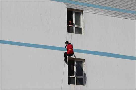 本次活動(dòng)假想新壘頭鎮(zhèn)中學(xué)學(xué)生宿舍樓三樓因線(xiàn)路設(shè)備老化發(fā)生火災(zāi),學(xué)生發(fā)現(xiàn)火情,迅速報(bào)告值班老師,值班老師到現(xiàn)場(chǎng)查看后通知值班室,然后迅速啟動(dòng)消防應(yīng)急預(yù)案,組織學(xué)生進(jìn)行緊急疏散。失火點(diǎn)位于三樓宿舍內(nèi),值班人員率先組織三樓學(xué)生進(jìn)行疏散,之后四樓值班人員聽(tīng)到廣播開(kāi)始組織學(xué)生疏散,五樓、二樓、一樓的學(xué)生在老師組織下依次有序疏散。經(jīng)過(guò)3分25秒,全校1100多名師生有序疏散完畢,趕到指定地點(diǎn)集合。 學(xué)校消防員接到火災(zāi)通知后迅速穿戴消防戰(zhàn)斗服及防煙面具,攜帶滅火器沖入火場(chǎng),處理初期火災(zāi)。因火勢(shì)太大,無(wú)法控制,通訊組匯報(bào)給校長(zhǎng),馮校長(zhǎng)立刻撥打了119火災(zāi)報(bào)警電話(huà)。得知一名同學(xué)昏迷,學(xué)校醫(yī)護(hù)人員迅速趕到宿舍樓,用擔(dān)架抬出昏迷學(xué)生,120急救人員立即進(jìn)行搶救。消防人員指導(dǎo)四樓被困學(xué)生用緩降器進(jìn)行自救,并派遣云梯車(chē)對(duì)樓頂學(xué)生進(jìn)行營(yíng)救。