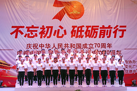 | 2019年9月20日,由辛集市政協(xié)辦公室、辛集市文化廣電體育和旅游局主辦,辛集市信德中學(xué)承辦的慶祝新中國(guó)成立70周年和中國(guó)人民政治協(xié)商會(huì)議成立70周年文藝演出在信德中學(xué)禮堂隆重舉行。 辛集市委副書記、政協(xié)主席姜?、政協(xié)副主席崔文英、政協(xié)副主席陳貴房,文化廣電體育和旅游局局長(zhǎng)馬懷建、市委辦副主任范士杰、教育局副局長(zhǎng)姜彥華,民盟、民建、民革、九三學(xué)社、僑聯(lián)等民主黨派代表出席本次慶;顒(dòng)。河北國(guó)超信息科技有限公司(以下稱“我公司”)、河北申科電子股份有限公司、萬愛農(nóng)業(yè)科技有限公司、河北天意行榮威4S店、辛集一街荷塘月色舞蹈隊(duì)、辛集市實(shí)驗(yàn)學(xué)校、辛集市信德中學(xué)等單位的職工代表隊(duì)表演了精彩的節(jié)目。 我公司四十余名員工由總經(jīng)理曹艷爽親自帶隊(duì),組成合唱團(tuán)參加了本次演出。公司高層領(lǐng)導(dǎo)高度重視本次演出,為順利完成本次文藝演出,公司黨支部、工會(huì)與各部門負(fù)責(zé)人認(rèn)真組織部署,共先后組織員工精心排演20余次。文藝演出在我公司42名員工激昂、深情的《我和我的祖國(guó)》大合唱中拉開序幕,接著我們演唱了熱情、歡快的《洗衣歌》,用歌聲表達(dá)了對(duì)黨和祖國(guó)的熱愛,把對(duì)黨的追隨凝聚成力量,用出色的演出詮釋了不忘初心、牢記使命的錚錚誓言,獲得在場(chǎng)觀眾和領(lǐng)導(dǎo)的高度贊譽(yù)。