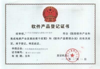 2014年8月18日,我公司研發(fā)的GC汽車手冊(cè)編寫與智能DTP軟件、GC網(wǎng)上項(xiàng)目庫(kù)管理系統(tǒng)順利通過(guò)河北省軟件評(píng)測(cè)中心評(píng)測(cè),并獲得了河北省工業(yè)和信息化廳頒發(fā)的軟件產(chǎn)品登記證書。