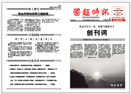 | 創(chuàng)刊詞 碧水共長天一色   夢想與激情齊飛               在這陽光明媚桃李爭艷萬物生發(fā)的春天里,《國超時訊》正式創(chuàng)刊與大家見面了,這是公司企業(yè)文化建設(shè)上的又一大事。在世界經(jīng)濟(jì)迅猛發(fā)展的今天,企業(yè)競爭的實(shí)質(zhì)是企業(yè)文化的競爭,優(yōu)秀的企業(yè)文化可以塑造良好的企業(yè)形象。對內(nèi)可增強(qiáng)員工的先進(jìn)經(jīng)營理念、超前的思想意識;激發(fā)員工的自豪感責(zé)任感和自強(qiáng)敬業(yè)精神;促進(jìn)民主管理和創(chuàng)優(yōu)爭先活動。對外,則對業(yè)務(wù)伙伴增強(qiáng)親和力;吸引力和信譽(yù)度,繼而促進(jìn)企業(yè)的發(fā)展。這即是創(chuàng)辦《國超時訊》的目的。