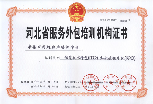 辛集市國超職業(yè)培訓學校被評定為"河北省服務(wù)外包培訓機構(gòu)"(證書)