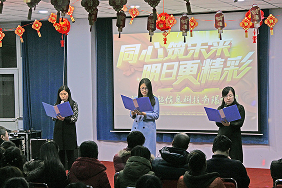 | 告別難忘的2017年,公司闊步走入充滿生機(jī)的2018年。新春佳節(jié)即將來臨之際,1月27日下午,公司舉辦“同心筑未來,明日更精彩”迎新春年會(huì)暨酒會(huì),“瑞雪翩翩兆稔景,犬蹄朵朵報(bào)春花”,年會(huì)開始前,一場意外的驚喜----晶瑩潔白的瑞雪紛紛揚(yáng)揚(yáng)從天而降,似乎上天也來給公司的活動(dòng)助興。與會(huì)嘉賓有:合資公司北京分公司的李華峰部長、李夢(mèng)一部長土屋部長、袁川室長、辛集市總商會(huì)謝忠生秘書長、汽車專家李虎臣老師等。 年會(huì)節(jié)目豐富多彩,員工表演了歌曲、集體舞蹈、詩朗誦、擲杯舞、手語舞、大合唱等節(jié)目,深情的歌曲表達(dá)了員工的心聲,充滿活力的舞姿充分表現(xiàn)出了年輕人的活力與激情,飽含豐富感情的詩朗誦和大合唱表達(dá)了員工對(duì)國超大集體的熱愛與奮發(fā)向上的決心,絕活“擲杯舞”表演時(shí)間雖短,但是其嫻熟、流暢的舞姿深深吸引了觀眾的眼球。年會(huì)上表演的節(jié)目均由公司員工自編自導(dǎo)自演,給在場觀眾帶來了一場精彩絕倫的視覺盛宴,與會(huì)嘉賓亦即興表演了精彩的節(jié)目,年會(huì)特約《超睿智學(xué)》10歲的小嘉賓和指導(dǎo)老師表演了令人眼界大開的節(jié)目“最強(qiáng)大腦”,現(xiàn)場表演了神奇的“蒙眼讀書”,整個(gè)會(huì)場充滿了熱情洋溢的節(jié)日氣氛。整個(gè)年會(huì)聯(lián)歡和諧、溫馨,富有激情。這是一場歡樂的盛會(huì),不僅展示了全體員工積極向上的進(jìn)取風(fēng)貌,也展現(xiàn)了公司充滿活力的企業(yè)文化氛圍。 本次活動(dòng),每個(gè)人都身兼多職,但忙而不亂,主持人的完美搭詞、工作人員的有條不紊、參演員工的認(rèn)真敬業(yè)使本次年會(huì)取得了圓滿的成功。下午5時(shí)30分共進(jìn)酒宴,大家歡聲笑語共慶佳節(jié),舉杯暢飲展望未來,共同迎接充滿生機(jī)和希望的2018年。